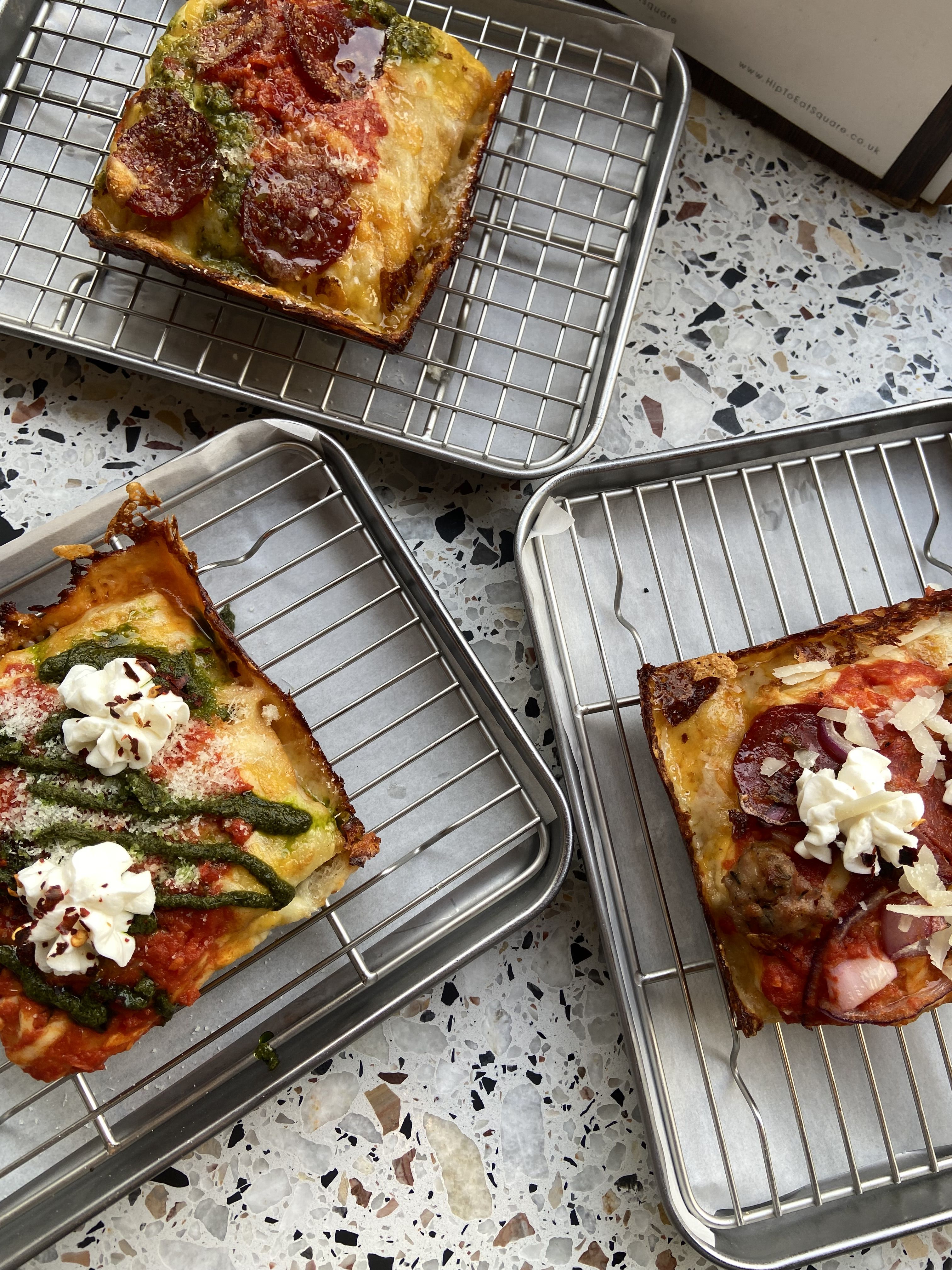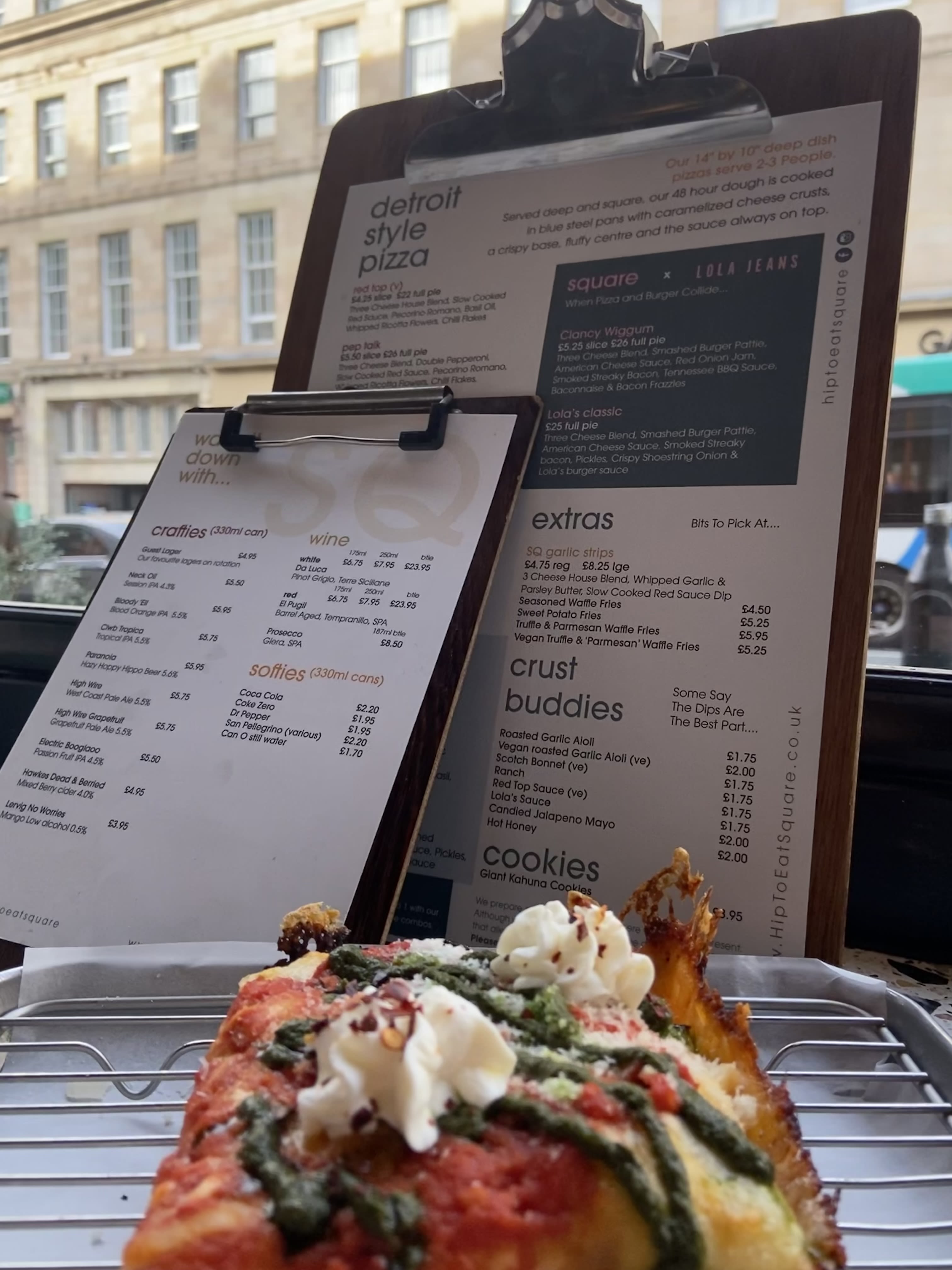 ‘Square’, which is located just a five-minute walk from Northumberland Street, on 1 Market St is open from lunchtime till the late evening. Whilst in the pricier section of this review with individual slices pricing at £4-6, Square holds the crown at my personal favourite. A Detroit style slice and pie menu, Square creates many of the most unique and exciting pizza flavours alongside succulent sides such as cheesy garlic bread and waffle fries. I personally tried the classic red top which consisted of a three-cheese house blend, slow cooked red sauce, basil oil and whipped ricotta flowers. However, the best part about it was the thick and crispy crust. Whilst this pizza parlour is on the more expensive side, the quality of the food is totally worth it.